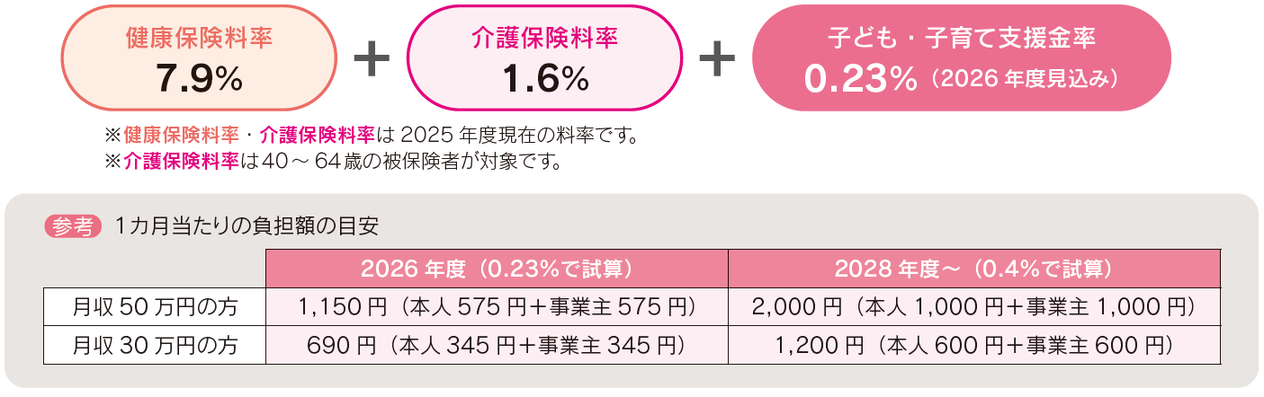 支援金率は、国が一律で示すこととなっており、2026年度から2028年度にかけて最大規模の0.4%程度に段階的に上がることが想定されます。2026年度の支援金率は0.23%となる見込みです。